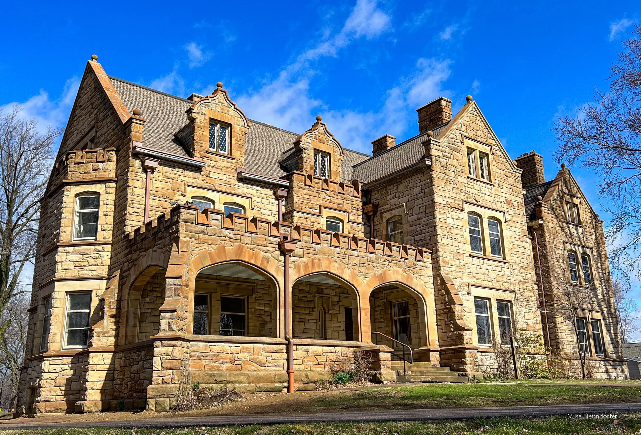 Schweinfurth designed Willoughby House in the Neo-Gothic style. The house was built with sandstone quarried in Amherst Ohio and delivered to the site by rail.